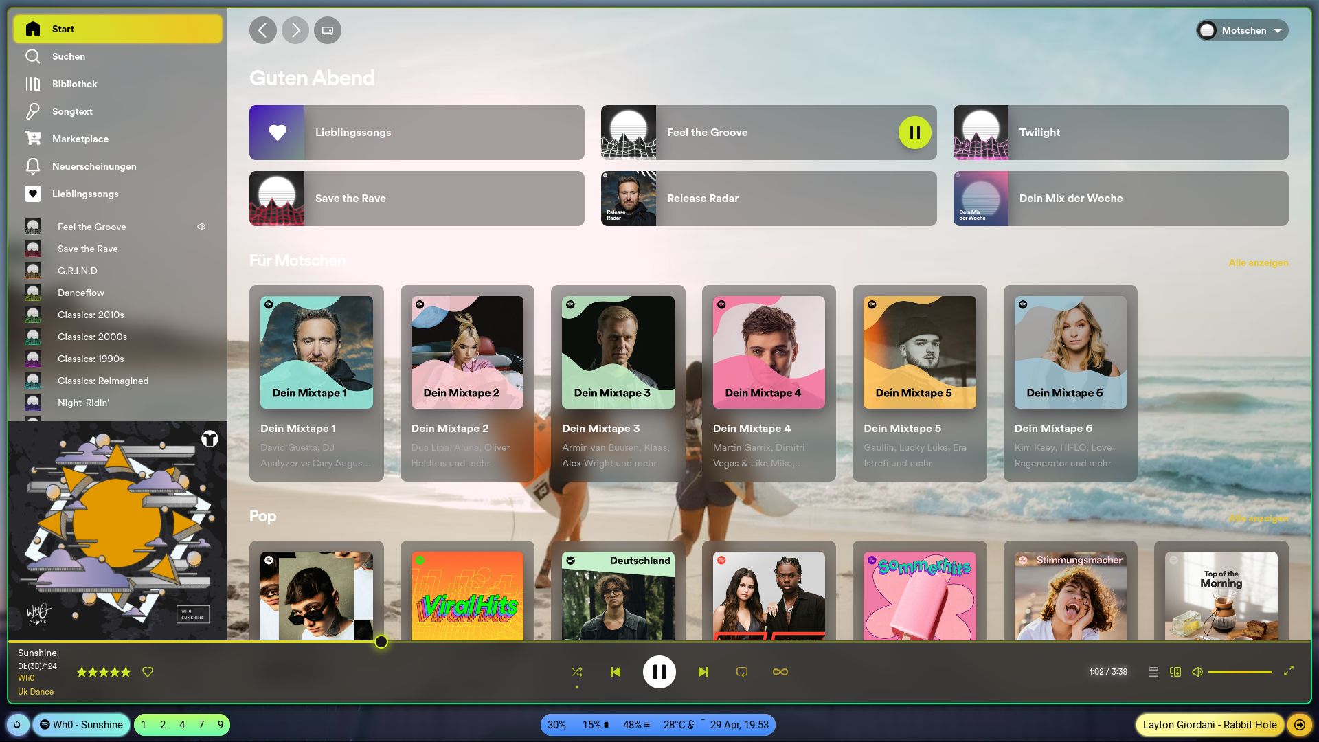 - Added many gradients that make Spotify way more colorful - Using dirty hacks, some of the gradients are even animated! - Completely revamped color themes - Fixed many little annoyances - On Linux systems, the big gap at the upper left corner (which houses the ... button on Windows) is removed - Fix some pages not having a blurred background (Your Episodes, Marketplace Readme, Options) - Fix many general Spotify bugs - Probably so much more :)